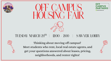 Moving off campus? Stop by the Housing Fair to speak with local realtors and leasing managers about apartments available close to campus! Door prizes and giveaways!